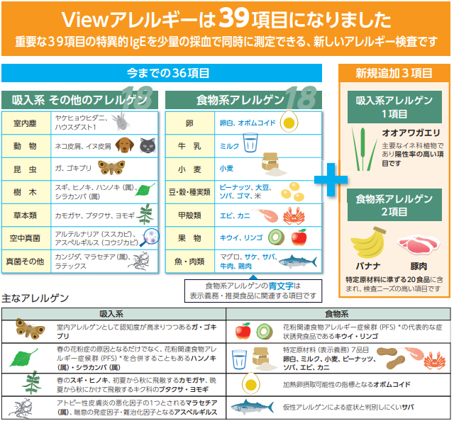 アレルギー症状で悩んではいるものの、何に対するアレルギーかがわからないという場合、幅広くアレルゲンを調べる方法として、「VIEW39」という検査があります。