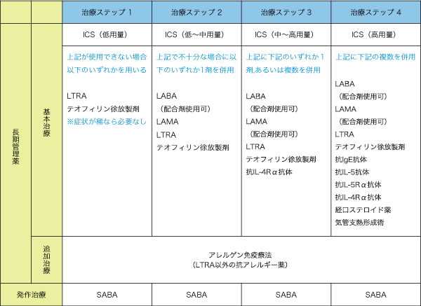 年長児の場合は、治療ステップ2から吸入ステロイドの治療が基本となります。