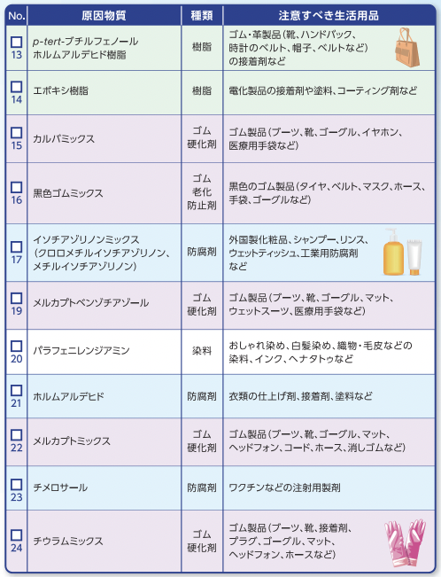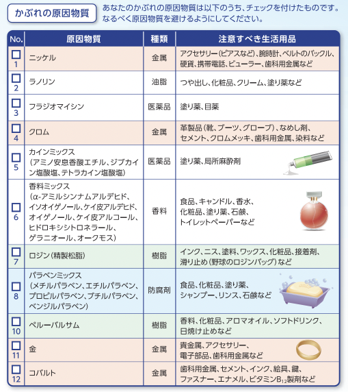 なかでも多いのは、アクセサリーの金属に多いクロム、ニッケル、コバルト、植物ではウルシやギンナンなど。